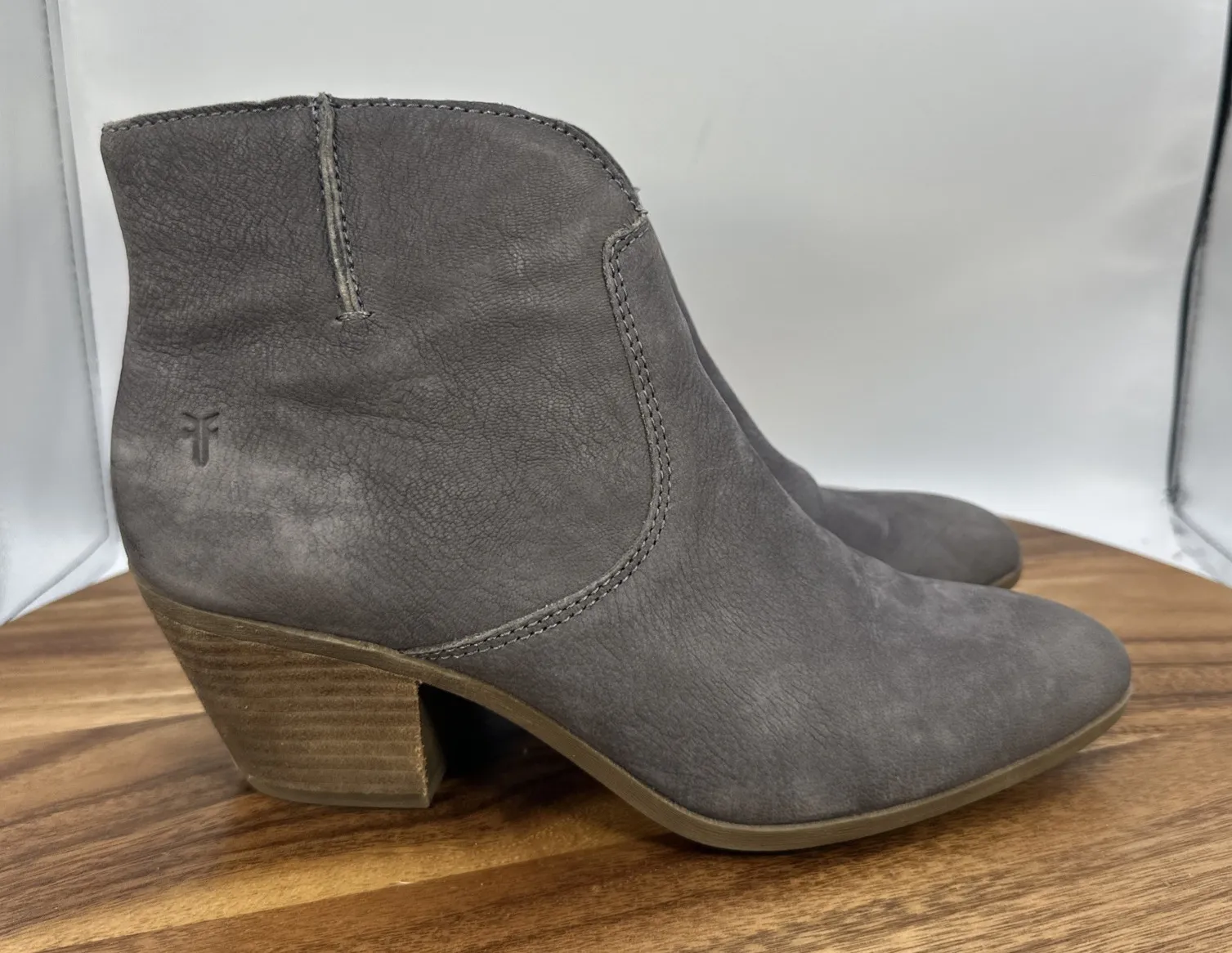 Leather upper Side zipper closure Almond toe Block heel height 2.5" Preowned. Some wear to the uppe... Show more