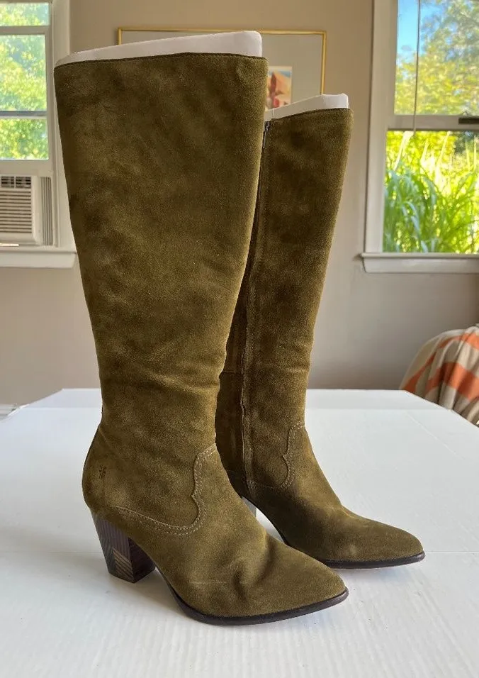 Frye Reed Sz 7M Olive Green Suede Side Zipper Tall Casual Dress Heeled Boots Upper Fabric : Pristin... Show more