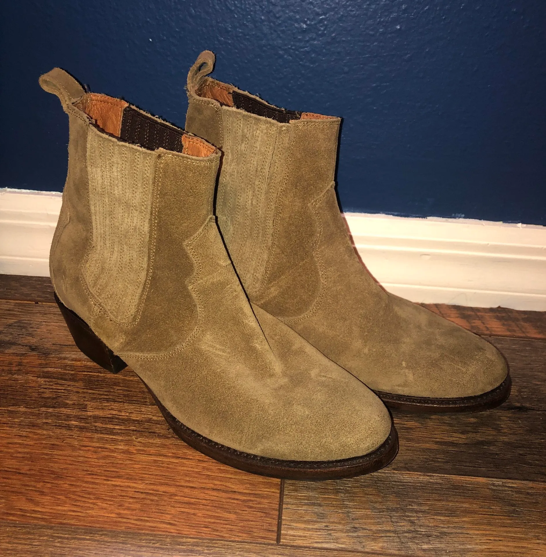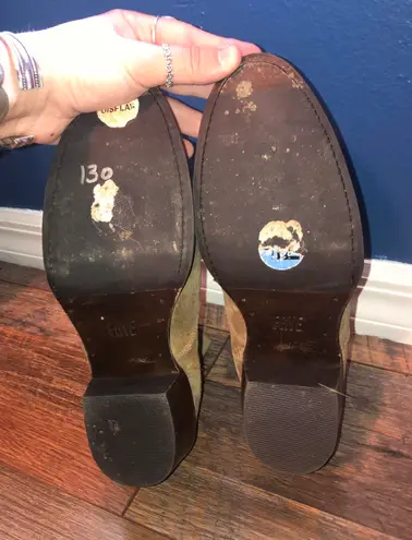 The cutest olive suede booties!!! (I know the lighting makes them look tan)They’re in good condition... Show more
