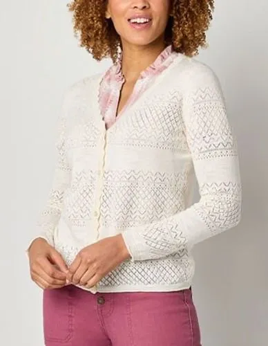 FRYE women's knit cardigan sweater in cream. This open front cardigan features a delicate lace knit... Show more