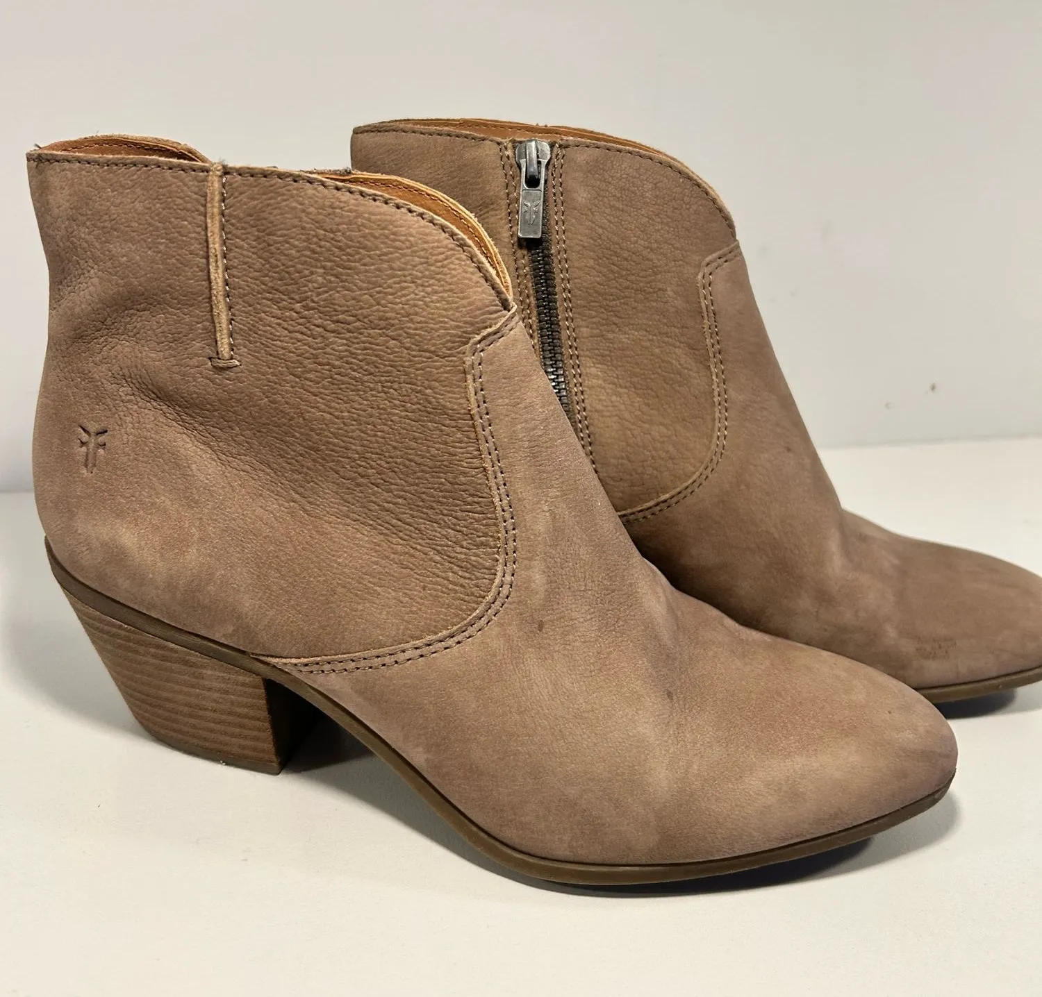 Frye women’s ankle booties crafted from soft nubuck leather in a taupe/grey-brown tone. Features a c... Show more