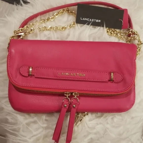LANCASTER PARIS Madem Marie Clutch Crossbody Bag Fuschia (hot pink) with gold hardware 100% Leather... Show more