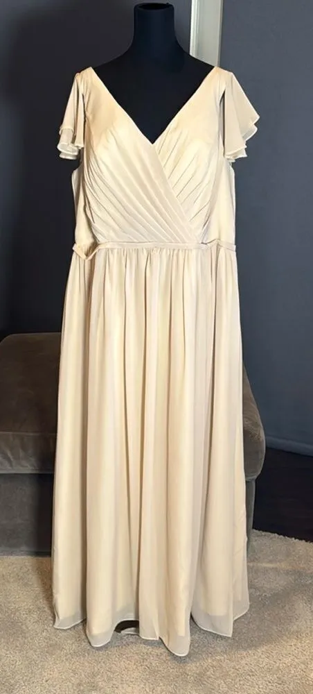 Women’s Full Length V-Neck Chiffon Formal Dress with Flutter Sleeve and a Corset Back. Beautiful Dress for all Formal Occasions - Bridesmaid, Mother of the Bride, Mother of the Groom, Party, Birthday, Celebration, Wedding Guest or Special Event! Tag Sizing: Bust 124cm (48.8”) Waist 116cm (45.7”) Size 22W/24W approximately - please see pictures for approximate lay flat measurements and to make sure this will fit. As this dress has a corset back there is room for size adjustment/fluctuation which is nice. The back panel is quite wide so room to go larger. I have it quite tightly laced in my pictures. The dress doesn’t hang that well on the small dress form, on the correct size person the chiffon will sit where it is supposed to! Sheer Flutter Sleeve (see picture) Built in bra pads Length from shoulder to bottom hem is 60”approximately. *Please note my camera washes out the color on close up pictures. Color is more accurate in further away pictures of the dress on the dress form *Color is subjective and may vary based on lighting and device used to view this item 2178B211