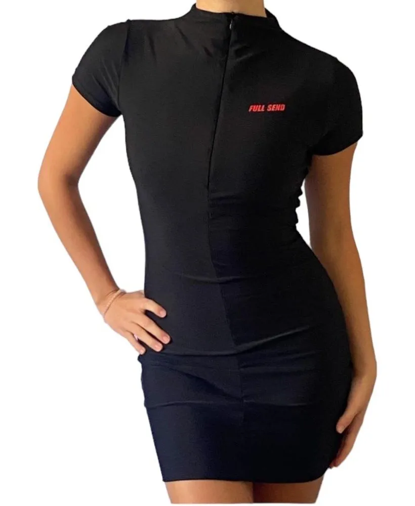 Introducing the Full Send By Nelk Boys Women's Fitted Bodycon Mini Dress, available in size Large and brand new! This trendy dress features a high neckline with a zip closure, short sleeves, and a solid black color. The tricot nylon material with spandex fabric type and stretch features ensures a comfortable and flattering fit. The dress is perfect for casual occasions and can be hand washed easily thanks to its garment care instructions. The dress also has a unique accent of a 1/4 zip and the Full Send logo, making it a great addition to any fashion-forward wardrobe. Don't miss out on this amazing dress that's perfect for any season! T-10