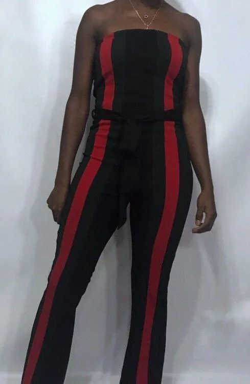 Full strapless figure hugging bodycon jumpsuit with a flare leg and tie at the waist Colors: black g... Show more