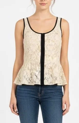 Cream lace peplum tank top from Full Tilt. Features a flattering peplum silhouette, black contrast t... Show more