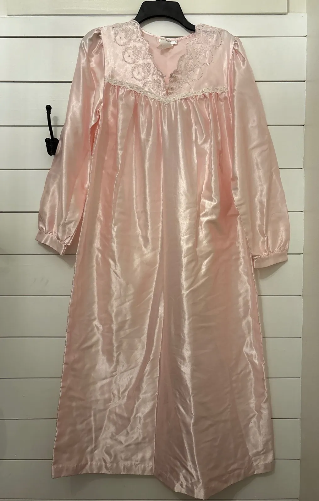 Embrace gentle elegance in this soft pink satin nightgown. Delicate lace trim adorns the V-neckline and cuffs, while pearly buttons add a touch of vintage charm. The flowing, silky fabric drapes beautifully, promising a comfortable and luxurious feel against your skin. Gathered detailing at the yoke creates a flattering silhouette. Perfect for cozy evenings at home, relaxing weekends, or as a thoughtful gift for a loved one. Measurements: • Bust: 36 in • Length: 52 in Anight Type: Gown Department: Women Pattern: Solid Material: Polyester, Cotton Fabric Type: Satin Sleeve Length: Long Sleeve Closure: Button Accents: Lace, Beaded Garment Care: Machine Washable Country of Origin: Dominican Republic Unit Type: Unit Keywords: pink nightgown, satin sleepwear, lace trim, vintage style, ladies nightie, feminine loungewear, comfortable, elegant, silk like, gift idea, boudoir, cozy