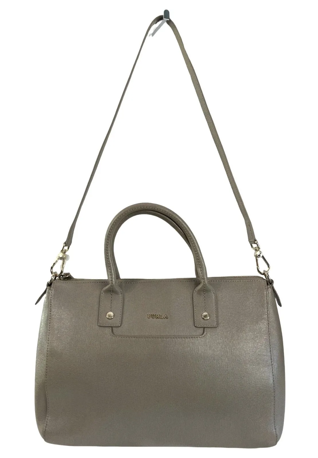 Elegant and structured Furla satchel crafted in durable saffiano leather in a beautiful neutral gray/taupe tone. This versatile bag features top handles plus a detachable shoulder strap, gold-tone hardware, and a roomy, well-organized interior — perfect for everyday polished wear. Made in Bulgaria for Furla using genuine leather. Condition: • Very good pre-owned condition • Some small discolorations on exterior • Small pen marks on interior • Minor cracking to edge coating on handles • No structural issues, clean interior overall, zipper works perfectly Details: • Brand: Furla • Material: Saffiano leather (genuine leather) • Color: Gray / Taupe • Made In: Bulgaria • Closure: Top zip • Hardware: Gold-tone • Interior: Fabric lined with zip pocket and slip pockets • Style: Satchel / Tote / Shoulder / Crossbody Measurements: • Length: 12" • Height: 10" • Width: 4" • Handle Drop: 3.5" • Strap Drop: 13" furla, italian designer, saffiano leather, satchel bag, tote bag, crossbody bag, structured bag, work bag, everyday bag, neutral handbag, gray handbag, minimalist bag, classic style, luxury accessory, gold hardware