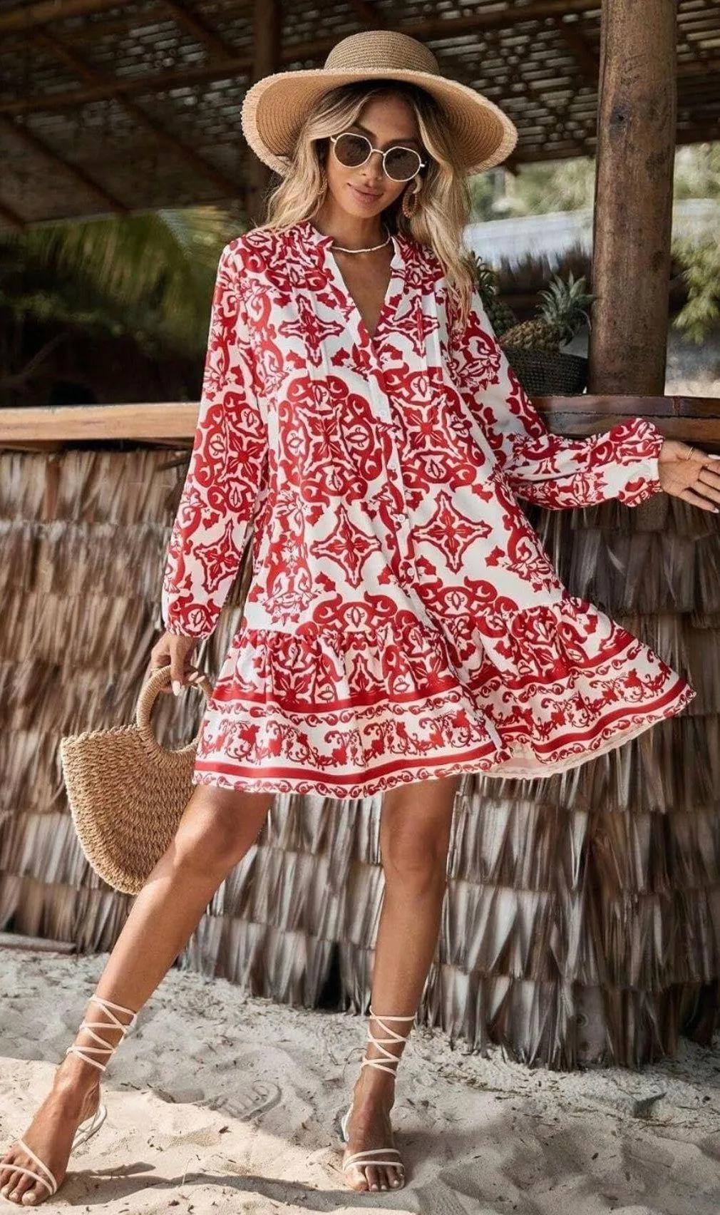 Floral Print Notched Neckline Ruffle Hem Smock Dress - Gorgeous Red And White Collarless Notch Neckl... Show more