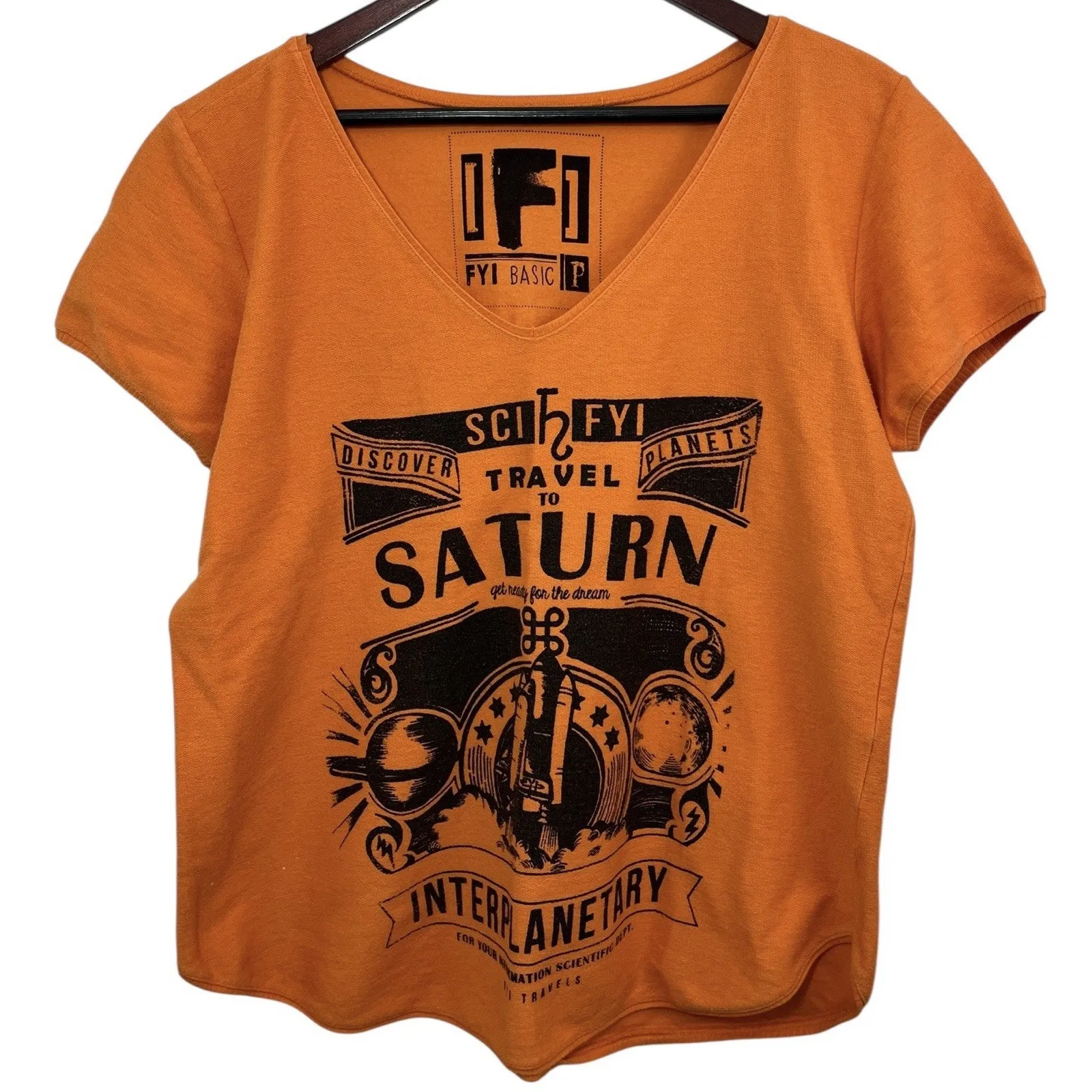 FYI For Your Information T-Shirt Orange Small Black Witchy Saturn V-neck Excellent condition Size isn’t clear on tag, but appears to be a Large. Please see measurements below. 100% cotton. Material feels a little bumpy like canvas, but it's light. Armpit to armpit - 20 inches Shoulder width - 16 inches Top to bottom - 25 inches Style profile: planets, witchy, Halloween, Whimsygoth, emo, Salem, Sci Fi, unique