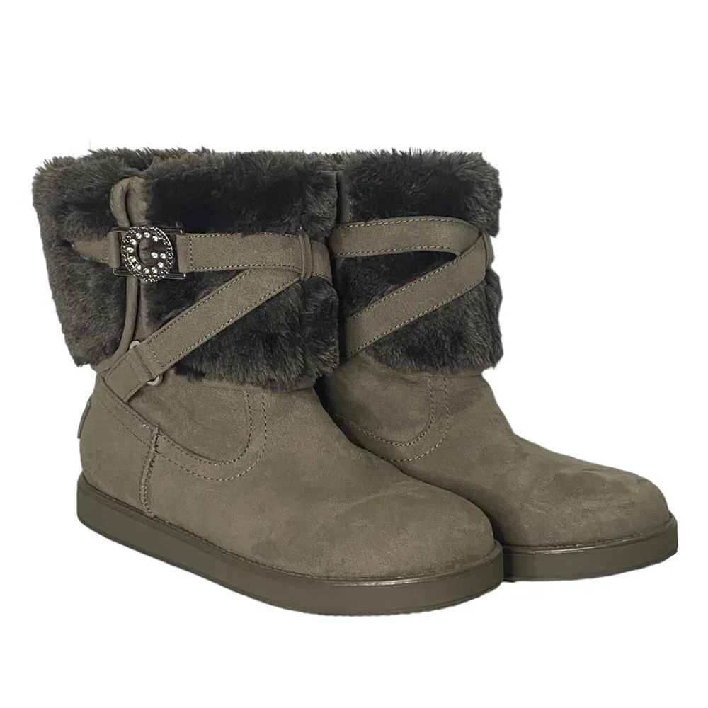 These boots are new without tags. No box. In excellent condition. A pretty neutral taupe gray. Faux Fur lined Faux Suede Criss Cross strap pattern detail with bling detail Round Toe Man made materials. Please see pics as they are part of my description. Clean and Smoke Free Home One small dog that is NOT allowed and cannot access this area but there could be some hair transfer. ******** FAST SHIPPING ******** Thanks for looking!