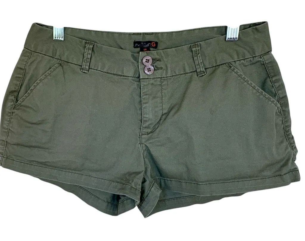 Please see all photos. The G By Guess Women's Chino Shorts in size 28 are a stylish and versatile addition to any wardrobe. These dark olive green shorts are made from a comfortable cotton-spandex blend, featuring a low rise fit and a button closure for a classic look. With a flat front design and regular fit, these shorts are perfect for casual or travel occasions, offering stretch for comfort and pockets for convenience. The G by Guess brand adds a touch of designer flair, making these shorts a modern and classic choice for any season.