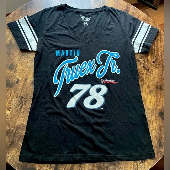 COLORS: black, blue, white, red. SIZE: S PIT2PIT: 18” p SLEEVE LENGTH: 7” LENGTH: 25” MATERIALS: 100% cotton. Women’s MTJ/Martin Truex Jr., Furniture Row, #78 tee. NASCAR driver. Short sleeves with stripes. V-neck. Ladies fitted top. Screened on the front is “Martin Truex Jr. 78. Furniture Row”. Brand new. Never worn. NWOT. #lady #ladies #women #womens #womans #woman #girl #girls #tee #shirt #tshirt #top #MTJ #NASCAR #martintruex #martintruexjr #furniturerow #78