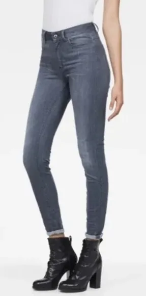 These G-Star Shape jeans are designed with curves in mind, where the seat offers maximum shaping. A high waist is combined with a super skinny fit. The shaped waistband wraps around the waist to eliminate any gaps. Size: 27x34 Color: Grey Medium Aged Super skinny fit High waist 5-pocket construction Tight from thigh to hem Zip fly Label at the back waist- cow grain leather Specially designed for women with curves Waist 13” Rise 9.5” Inseam 33” Leg Opening 4.5” NWT - new with tags
