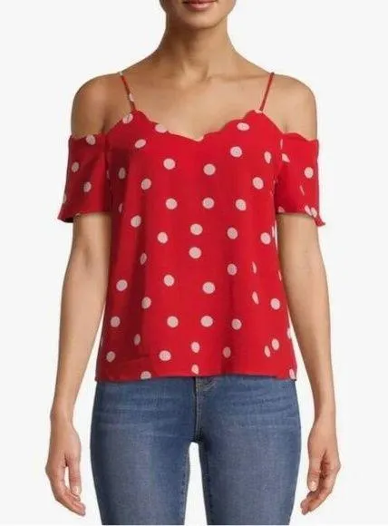 Vibrant red and white polka dot top that will give the Disney Minnie mouse vibe. Scallop neckline. E... Show more