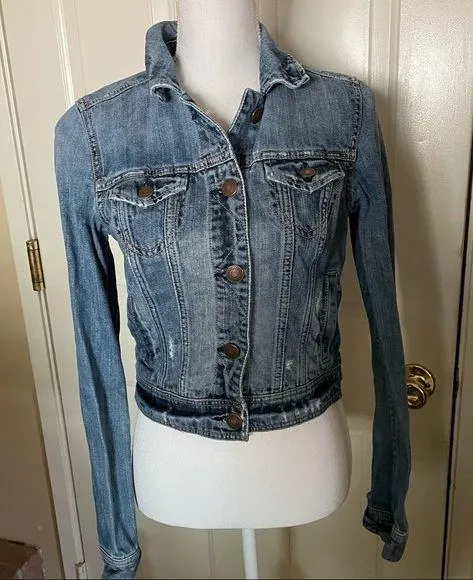 Pre-Owned American Eagle Jean Jacket in a size Small/Petite. Denim is distressed with some shreds. B... Show more