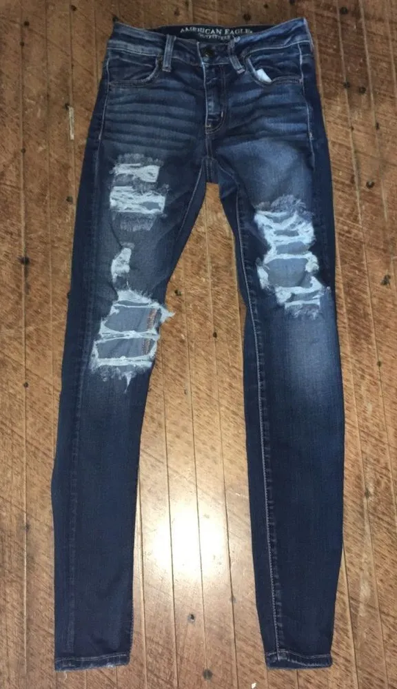 American Eagle Distressed, destroyed dark wash jeggings. Cropped. In good, used condition. Approxima... Show more