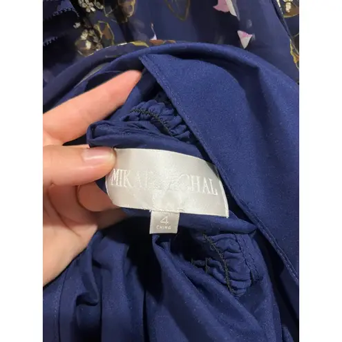 Elegant navy blue floral ruffle midi dress by Mikael Aghal. Features tiered layers, long sleeves with ruffle cuffs, and a smocked waist for a flattering silhouette. Tassel tie detail at the neckline adds a chic touch. Brand: Mikael Aghal Size: 4 (see measurements below) Color: Navy with pink floral print Style: Ruffle tiered midi dress with tassel neckline tie Lined body, sheer sleeves Approx. length: 36" shoulder to hem Approx. pit to pit: 21" Material: Polyester blend (feels like chiffon) Made in China Condition: Pre-owned. Overall in good condition, but there is a small seam separation under the arm (see last photos). Still wearable as is, or could be repaired. Priced accordingly.