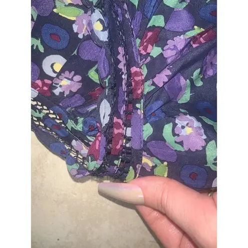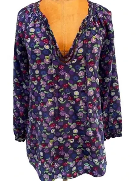 This stunning Rebecca Taylor silk tunic blouse is a must-have for any fashion-forward woman. With a beautiful floral pattern, 3/4 sleeves, and a v-neckline, it's perfect for any occasion, whether you're traveling, attending a wedding, or just looking for a versatile top for a party or casual outing. The blouse features a tie closure and is accented with tasseled and embroidered details, giving it a bohemian flair. has some fading under the arms. small holes from thread under arms. priced low because of this. Made from lightweight and breathable silk, this blouse is comfortable to wear in any season, whether it's summer or spring. It's a relaxed fit and comes in size 0, with a multicolored blue color scheme that's sure to turn heads. The blouse is perfect for those who love designer clothing, with its butterfly, beach, and California themes. Don't miss out on this classic and stylish piece! Some tiny thread holes under the arm pits as pictured. Used condition