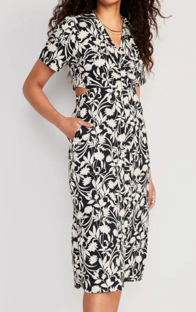 Elegant midi dress with floral pattern. Features stylish cut-out sides. Ideal for any occasion.