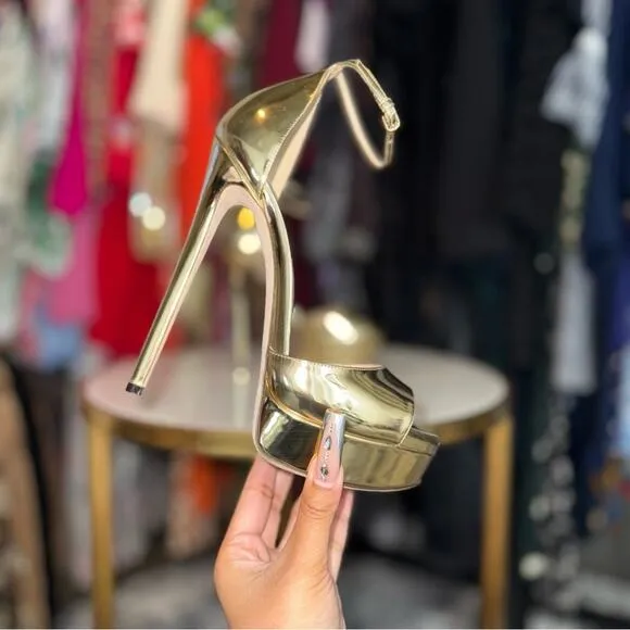 So gorgeous! 🖤 Popular style currently seen on many celebrities including Megan Fox, Lori Harvey, Hailey Bieber, J-Lo, Savannah James, Becky G and more! *Small flaw on the left upper - see last photo + video* Great condition with wear to the bottoms - see photos. These MAX pumps feature a chunky platform, a pin-thin stiletto heel, a delicate ankle strap with buckle fastening, a metallic gold mirrored leather upper and heel cover, an open-toe front and a leather sole and lining. Approx., 6” heel height/150mm. Made in Italy. Size IT 40.5 - JC typically runs a half to full size small. Disclaimer: PLEASE know your European shoe size, as most designer shoes run more narrow and typically a half to full size small. Please read online reviews before or do an in-store try-on before purchasing or ask me any and all questions!
