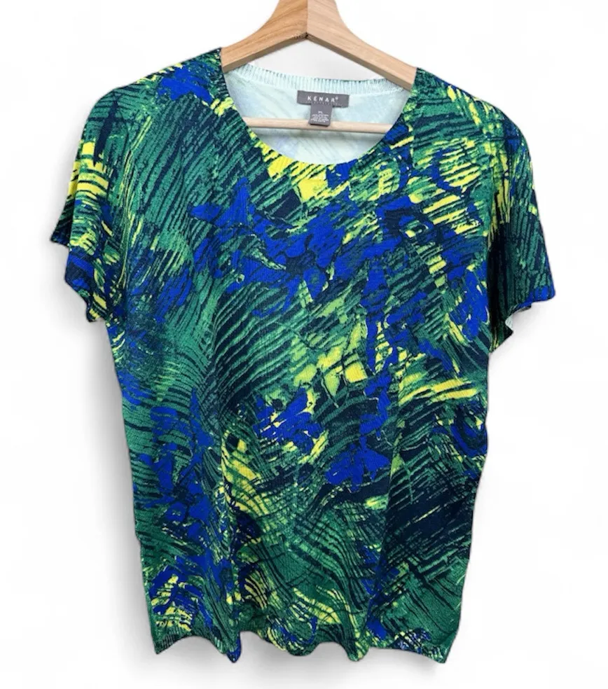 KENAR Top Womens Size XL Multicolor Abstract Tropical Print Short Sleeve Artistic Vibrant Condition: New with tags Size: XL Material: 38% VISCOSE, 33% SILK, 29% NYLON Features: Short sleeve, round neck, abstract print, vibrant multicolor design, Lightweight top Measurements: approximately Sleeve length 7” Chest width 21” Total length 25.5” Smoke Free Environment Tags: abstract print, tropical, vibrant, knitwear, summer, spring, artistic, casual, modern, colorful, resortwear, lightweight, business, office, school, church,