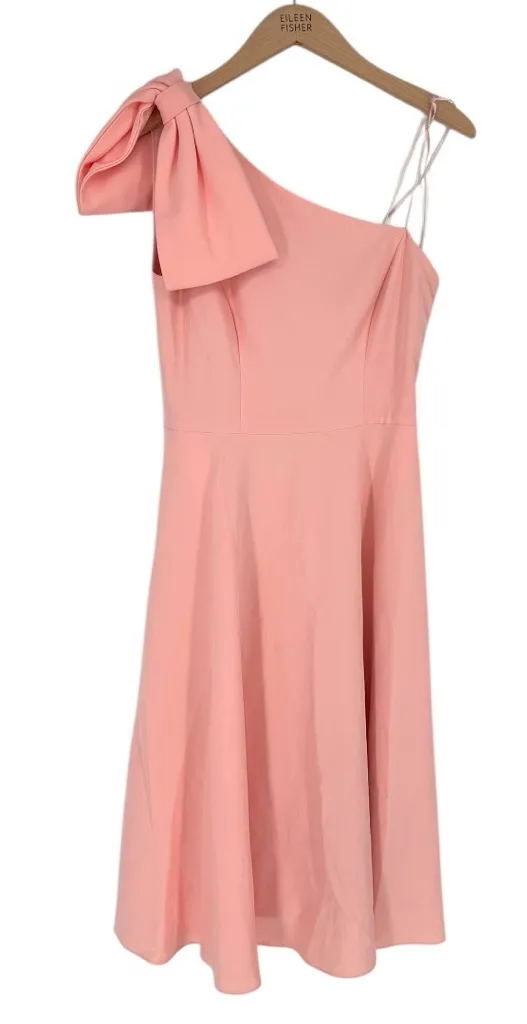 Rose quartz color One shoulder with bow detail Fit and flare silhouette Back zipper and hook and eye closure Side slit pockets Fully lined Flaw- bow on front side needs tacked back down, does not really affect wear. Has potentially been altered, as it has an alteration tag, but was not worn. Approx flat measurements PTP- 16.5” + darting Waist 14” Length from center of back to hem 43.5” Fabric has some stretch.