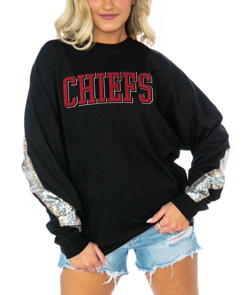 . It’s an oversized size M. In like new condition, with no visible signs of wear. $68 retail. This long-sleeve shirt is a Kansas City Chiefs apparel item from the brand Gameday Couture, featuring a silver and gold sequined embellishment design on the sleeves, and top back area. 100% cotton (not the sequin or lettering) Tags: NFL apparel, Kansas Chiefs, game day, football, long sleeve shirt.