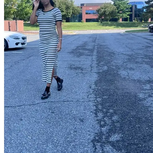 The Ganni Striped Soft Cotton Rib Short Sleeve Dress is a casual yet stylish piece that features a soft, ribbed organic cotton fabric, ruched sides, embroidered logo for a comfortable fit. With its classic stripe pattern and short sleeves, Nautical, Tennis, Preppy, Prep, Country Club, old money, quiet luxury vibes. crew neck Short sleeves Pulls over 95% Organic Cotton, 5% Elastane Machine wash delicate - line dry Size Small (stretch) Armpit to Armpit ~18" ~59" length ruching can make this a midi or maxi dress Excellent Condition Retail $325