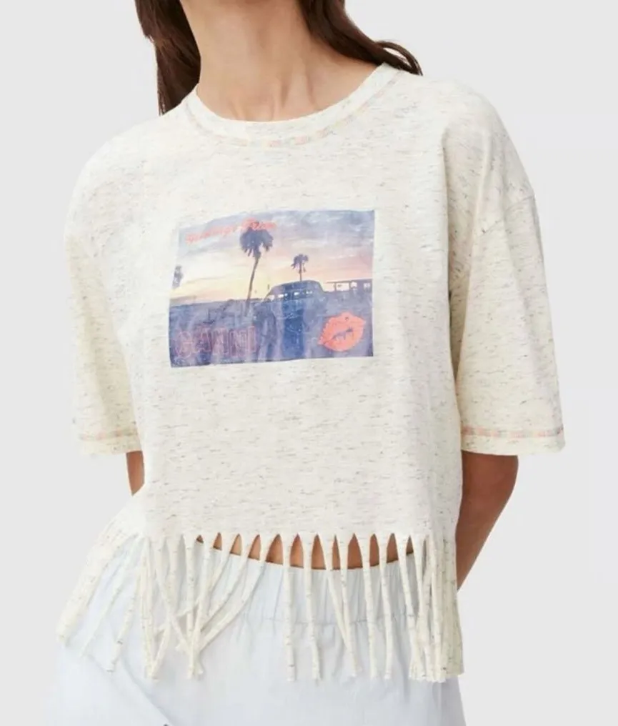 EXCELLENT CONDITION! GANNI CROPPED SHIRT WITH FRINGE AT HEM GRAPHIC BEACH PRINT ON FRONT COLORFULL RAINBOW TOP STITCHING IVORY WITH DARK GREY SLUB KNIT SIZE MEDIUM APPROXIMATE MEASUREMENTS: 21“ UNDERARM TO UNDERARM 16.5“ LENGTH FROM HIGH POINT OF THE SHOULDER TO TOP OF FRINGE 22“ LENGTH FROM HIGH POINT OF THE SHOULDER TO BOTTOM OF FRINGE