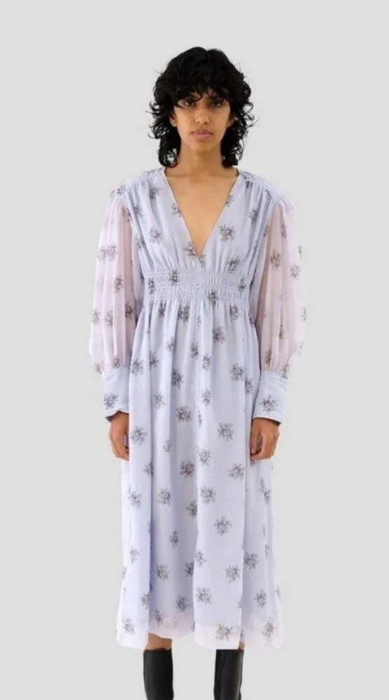 GANNI Organza Printed Smock Dress Color: Heather Blue Floral Print Style #: F6457 Size: EU 34 Condition: New with Tags A delightful confection to be dressed up or down. This airy organza midi dress comes in a delicate floral print, featuring sheer balloon sleeves and a stretchy shirred waistband. Lightweight floral print midi-dress with a comfort smocked waist and long balloon sleeves V-neck Drop shoulders Long balloon sleeves with barrel button cuffs Smocked waist Organza Crinkled Shirred trims Elasticated waist Gathered sleeves Buttoned cuffs Two side slit pockets Pullover style Slips on Fully lined Fluid fabric Lightweight fabric Fabric: 65% Recycled Polyester, 35% Polyester Machine wash cold, do not tumble dry. Made in China Approximate Measurements: Pit to Pit 16" Waist 27" (un-stretched) Hips 58" Sleeves 22" Wrist Cuffs 8" Shoulders 17" Back Length from Shoulder 48.5" Special Occasion Garden Party Brunch Cottagecore Lunch Date Fairycore Whimsical Feminine Romantic