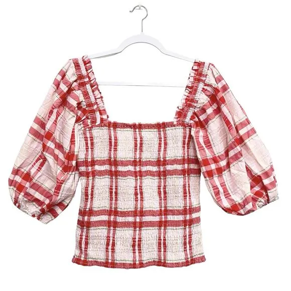 NO SIZE TAG- removed by previous owner—see measurements. Preloved and washed. This Ganni top is a must-have for any fashion-forward woman. The plaid print, square neckline, and backless design make it a unique and stylish addition to your wardrobe. The blouse features a pullover closure, 3/4 balloon sleeves, and ruffle accents for added flair. The top is made with stretch material and is available in a regular size. The red and white color combination is perfect for any occasion. This Ganni top is perfect for pairing with high-waisted jeans or skirts for a trendy and chic look.