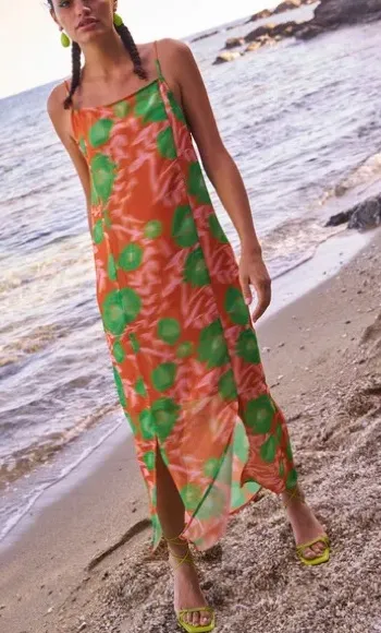 DESCRIPTION - Brand: GANNI - New With Tags - Orig: $255 - Color: Vibrant Orange Flower - Fabric: Crepe - Pockets: None - Regular fit - Square neckline - Hidden side zip closure - Fixed spaghetti straps - Two slits at the front - Partially lined - 100% certified recycled polyester APPROX. MEASUREMENTS: - Size: FR36 = US 4 - Bust: 34” - Waist: 26” - Hips: 38” - Body Length: 52” Actual item for sale is pictured using a mannequin. For sizing reference, our mannequin’s measurements: Bust: 35.5” | Waist: 26.5” | Hips: 38.5” | Height: 5’11