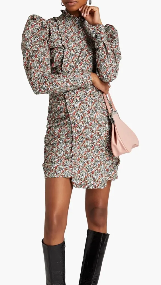 GANNI Ruched Floral-Print Organic Cotton-Poplin Mini Dress Size 32- US Size 0- size chart included Retail $295 Excellent preloved condition, fabric near zipper is ripped, but no hole and very hard to see when on! GANNI's mini dress is patterned with an array of whimsical florals that nod to the brand's love of nature. Cut from organic cotton-poplin that's ruched through the front, it's detailed with ruffles and exaggerated shoulders. Style yours with chunky ankle boots.