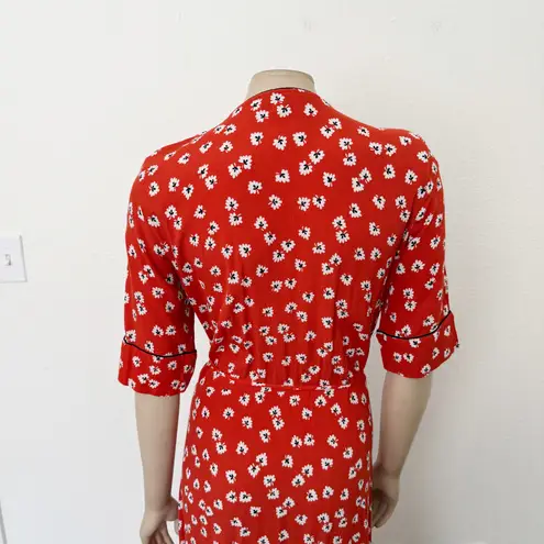 Ganni Size Large L Silvery Crepe V-Neck Floral Print Wrap Red Apple Maxi Dress Good, Pre-Owned Condition Size: Large, EU 40 Brand: GANNI Color: Apple Red Floral print V-neck Contrast piped trim Wrap style Maxi length Half sleeves Ruffle layered asymmetrical hem skirt Lightweight flowy style 100% Viscose Measurements: Bust: 19 inches Waist: 15 inches Length: 55 inches