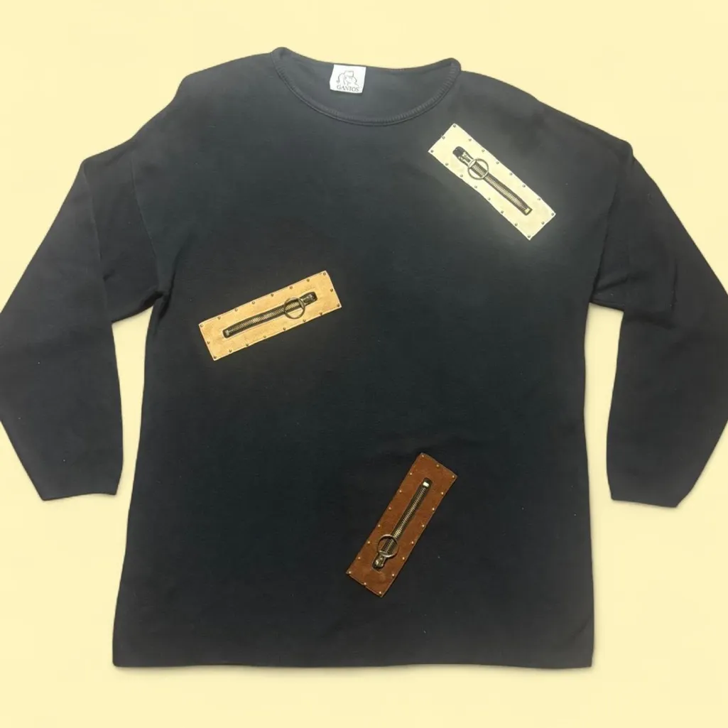 Black cotton long sleeve shirt Unique zipper design 1980s vintage retro shirt 3 functional metal zippers with faux leather / suede trim - the zippers unzip but it’s not much of a pocket More for decoration Tan and brown trim neutral colors No size tag fits XL-XXL but can also wear oversized on a smaller frame Solid black back Soft slightly stretchy mid to heavyweight fabric Some fading as shown 100% cotton Approx measurements laying flat Pit to pit 23” Length 28” Excellent vintage condition light wear Freshly laundered Smoke free home