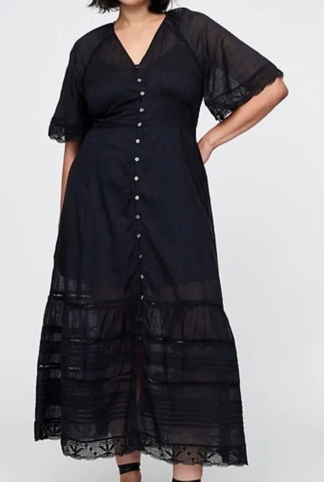 Amazing long midi dress from GAP! Solid black, semi-sheer, flutter sleeves. Lace and embroidery deta... Show more