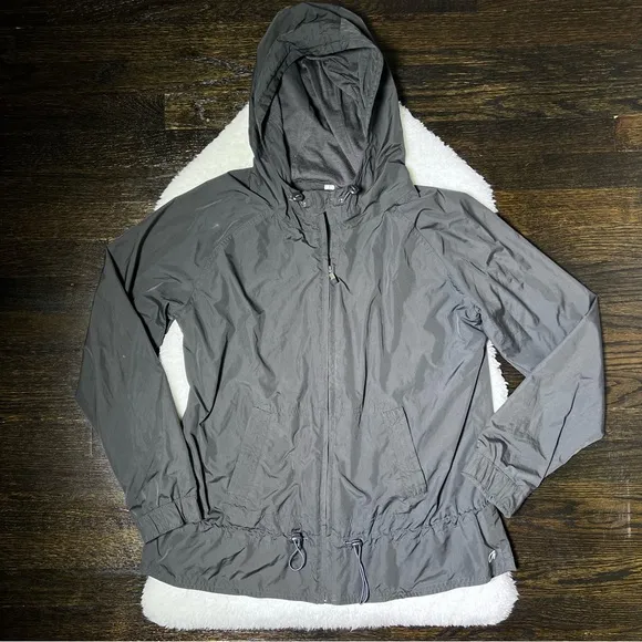 Preowned / used jacket from GAP. Soft black / dark charcoal gray color. Front pockets. Hooded. Ligh... Show more
