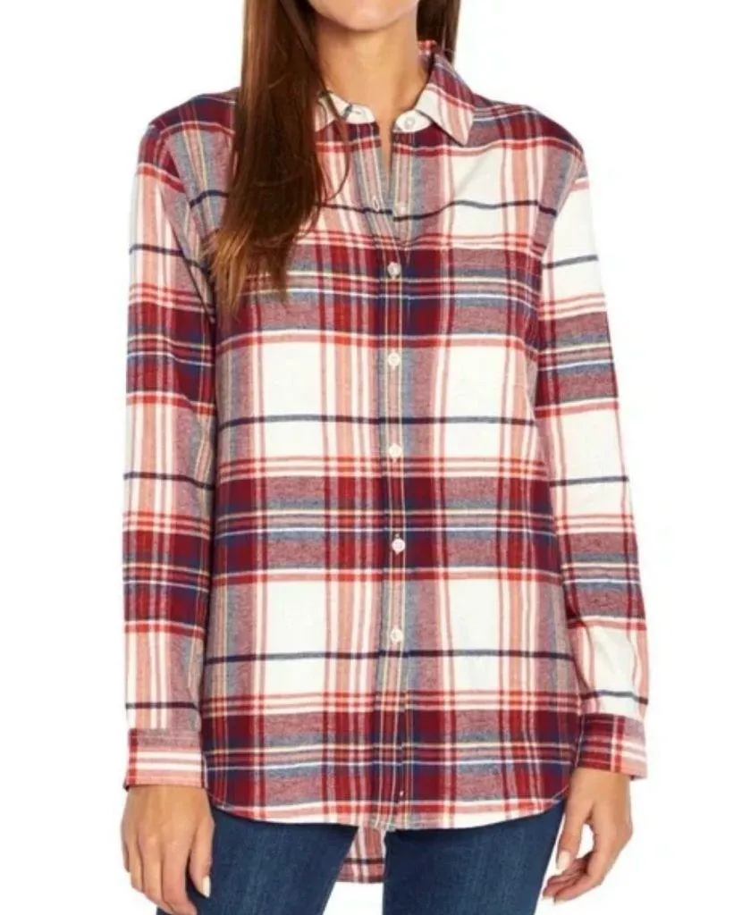 GAP Boyfriend Flannel Button Up Shirt Maroon Red Navy White Perfect for layering in cooler weather... Show more