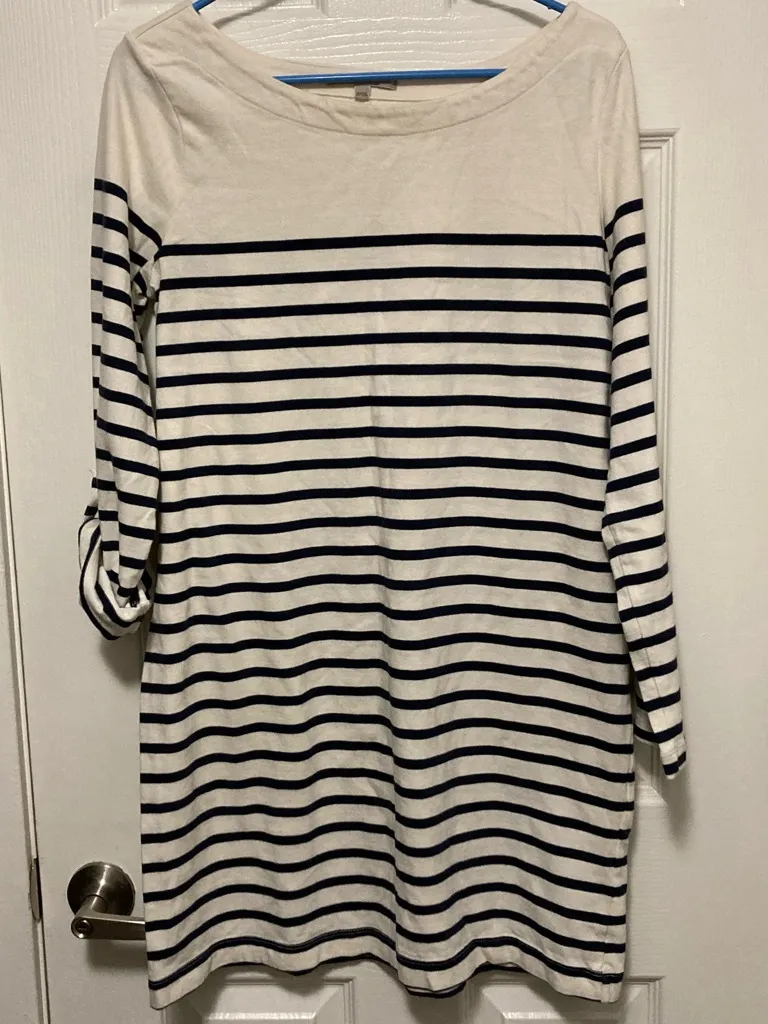 Great Used Condition Ivory with Navy Stripes 100% Cotton Pit to Pit: 19” Length: 34.5” Size Medium