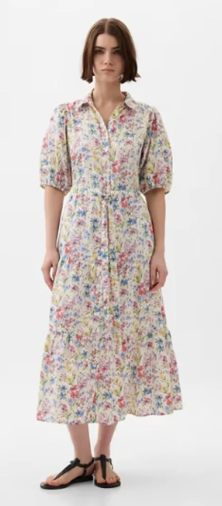 Excellent used condition floral midi dress. Tiered skirt. Shirt dress style. Minor wash wear. Charm... Show more