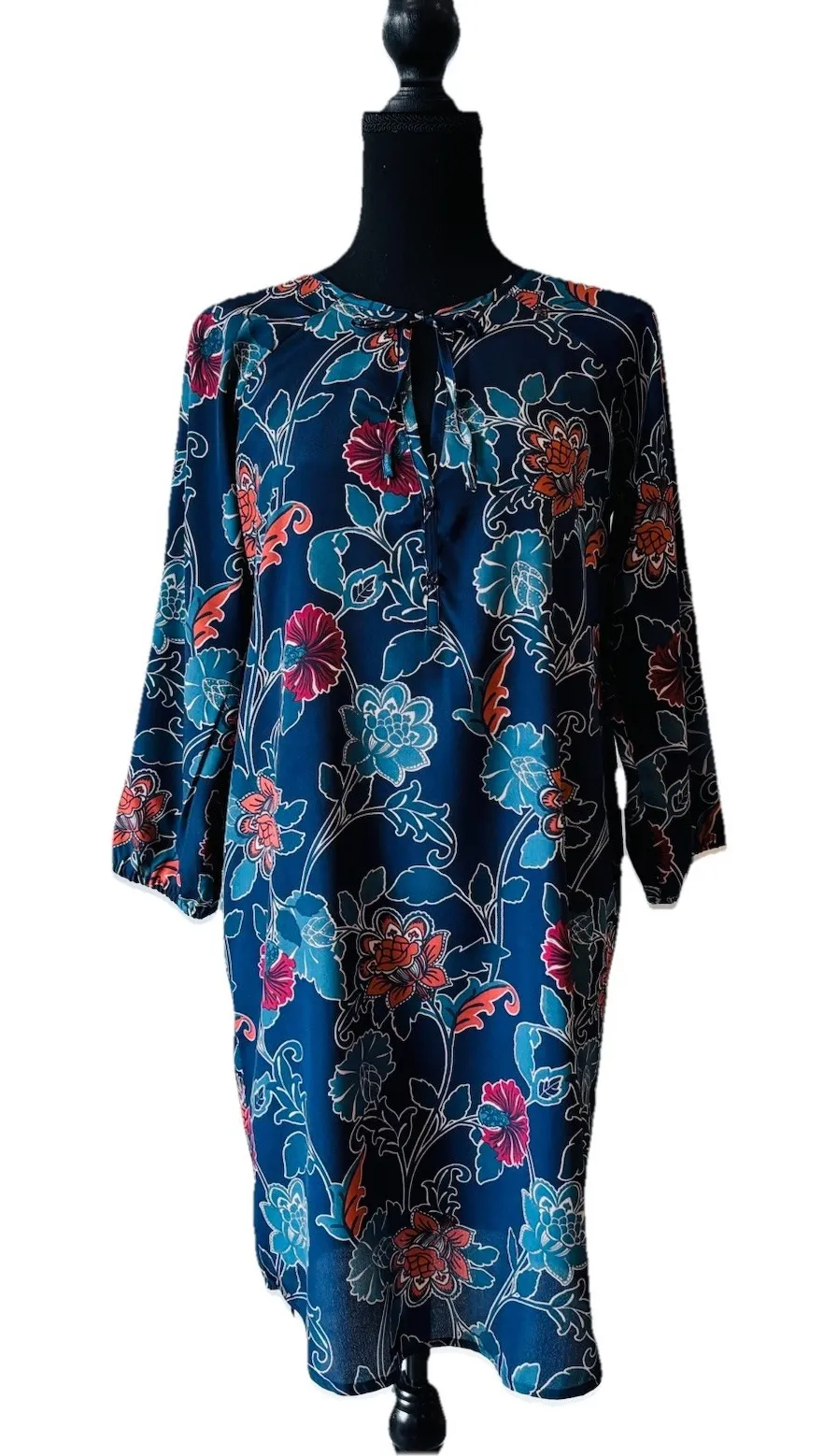 Lightweight navy dress with vibrant floral print and keyhole neckline. Loose fit with long sleeves... Show more