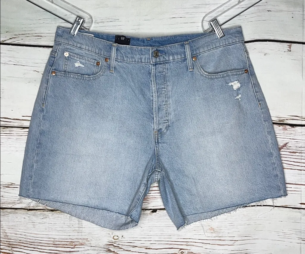 Gap Size 34/18R Light Blue Wash Denim High Rise Distressed Cheeky Midi Jean Shorts. Belt Loops. Butt... Show more