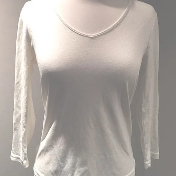 V-neck off white colored long sleeve top. It has a shimmer to it that is hard to capture with the c... Show more