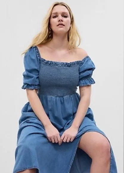 Chic blue midi dress with puff sleeves and a side slit. Perfect for casual outings. Soft denim midi... Show more