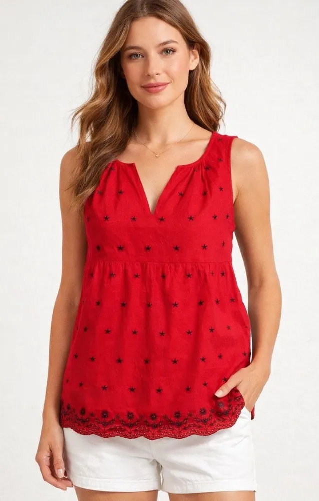 Classic and feminine, this GAP red sleeveless pullover blouse features delicate eyelet embroidery wi... Show more