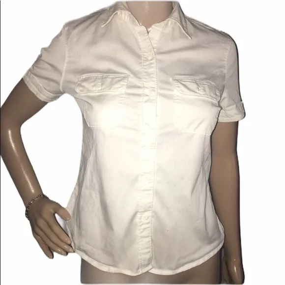 Short sleeves. Stretchy fit. Buttoned breast pockets. In excellent condition! 17" pit to pit x 22" l... Show more