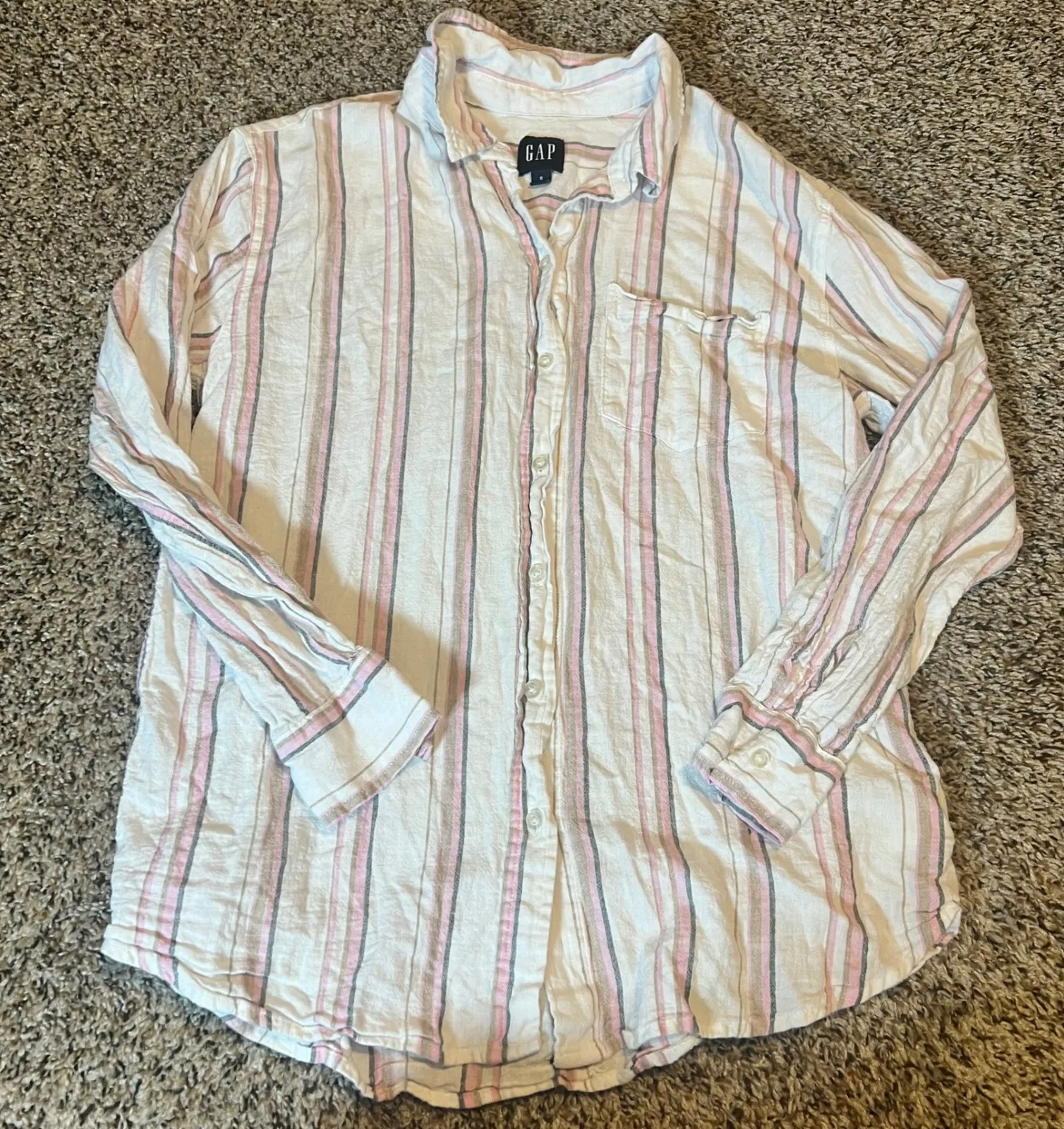 A women's long-sleeve button-down shirt by GAP in a classic striped pattern. This versatile top feat... Show more