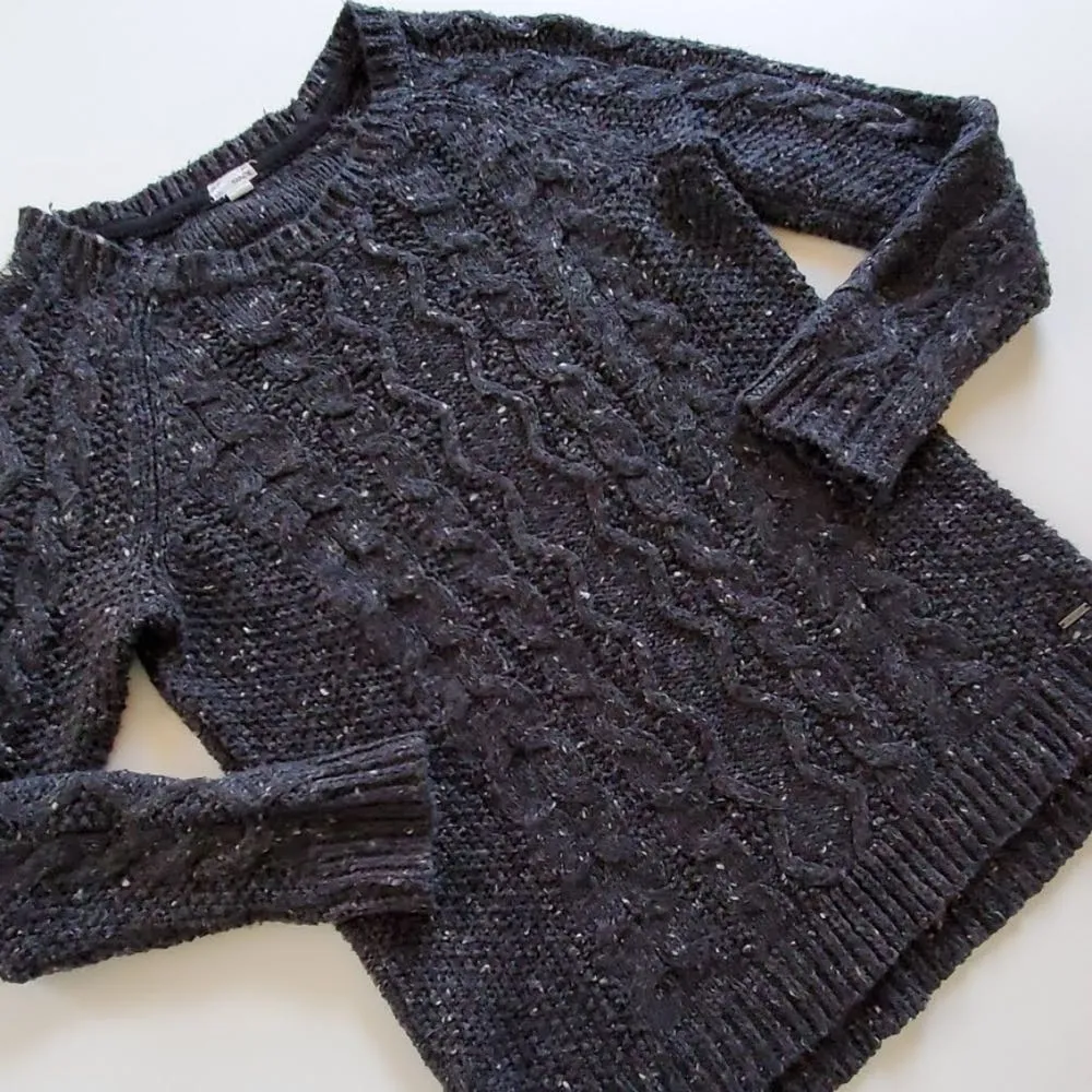 Cozy speckled longline cable sweater size small with a 19" bust and 26" length 100% acrylic hand was... Show more