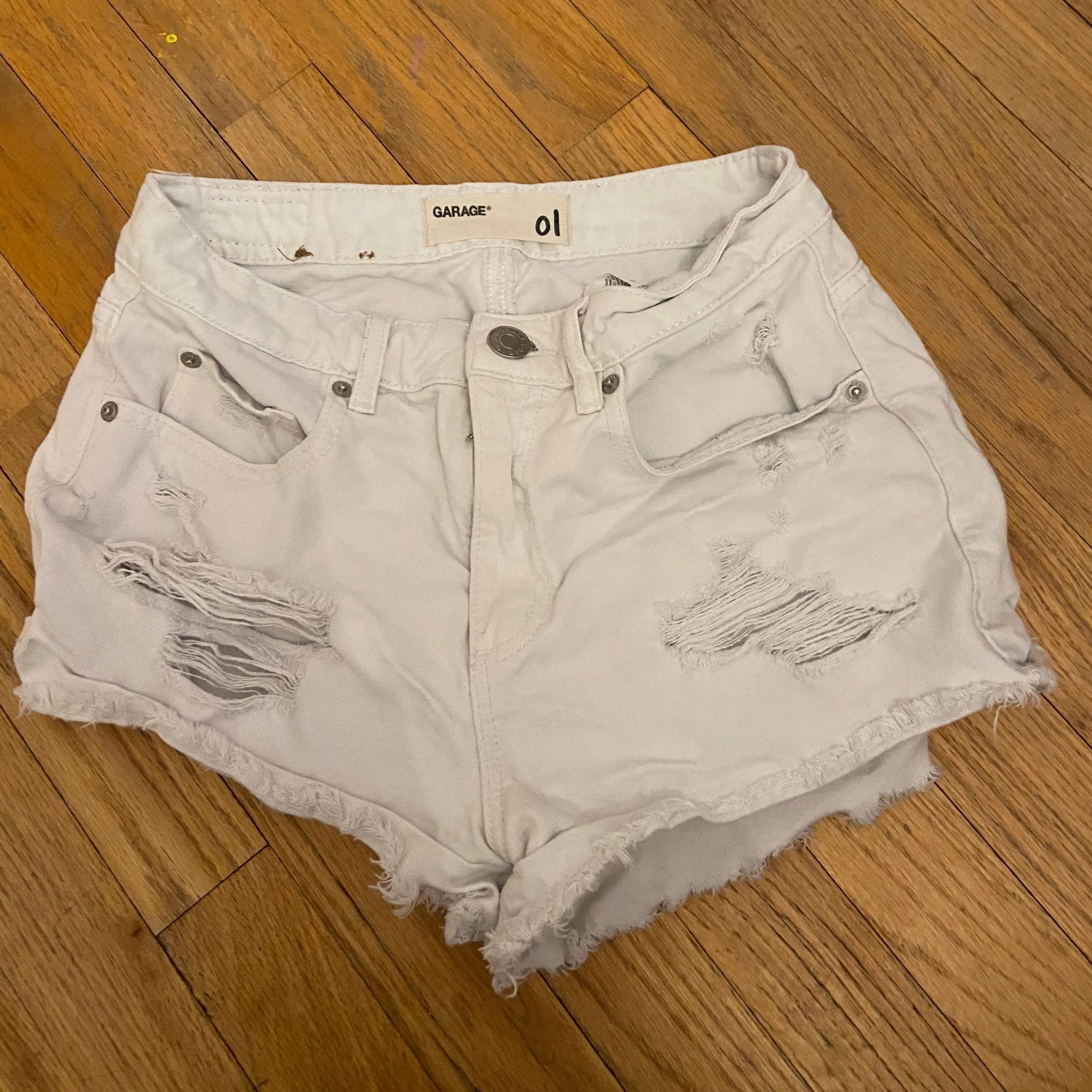 Some cute basic distressed white denim shorts! worn a few times- basically brand new no flaws or st... Show more